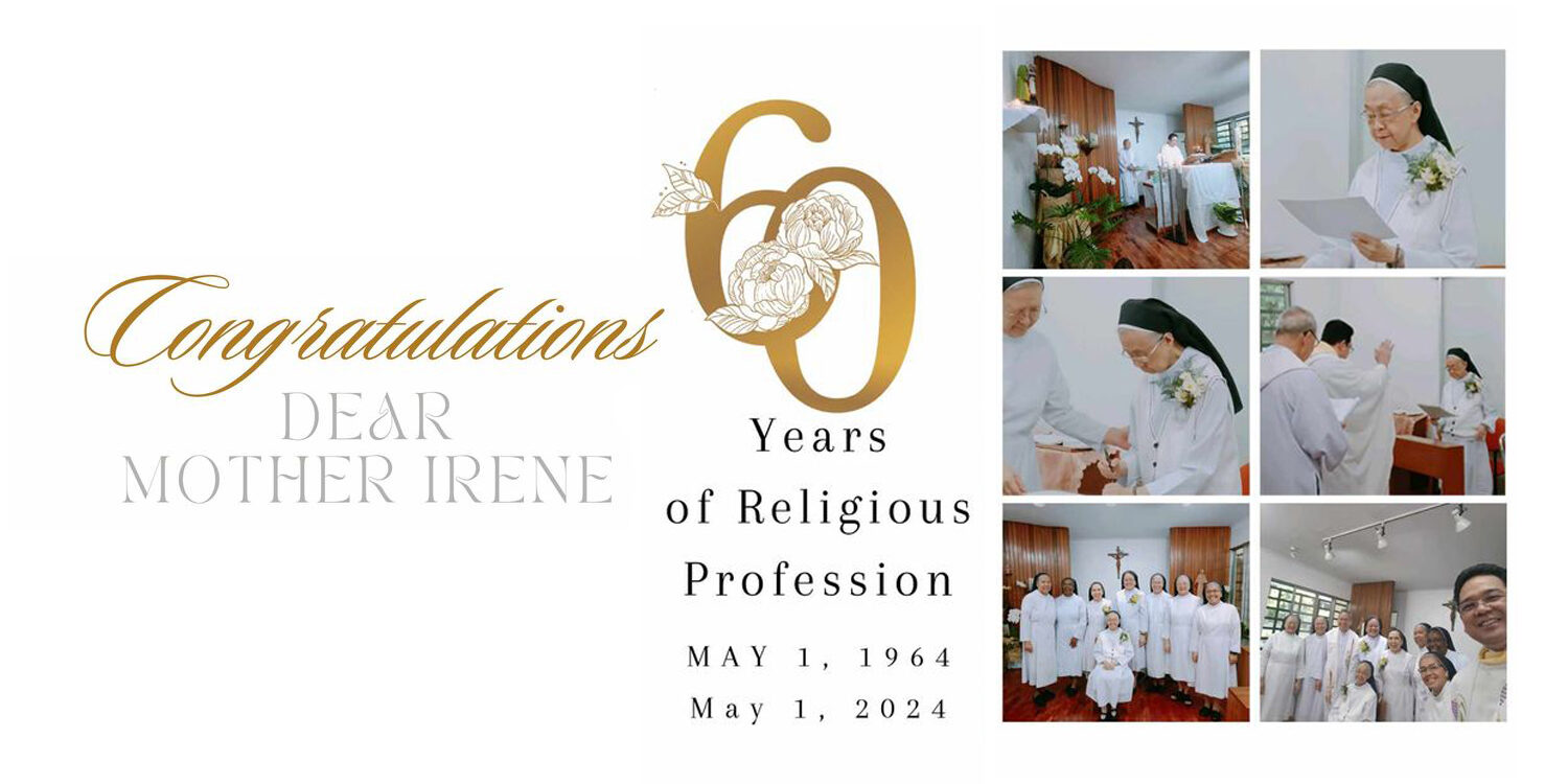 May12024 On May 1, M. Irenen Dabalus celebrated her jubilee of 60 years profession in Tagaytay / Philippines. She was Prioress General of our Congregation from 1994 to 2006. Congratulations,and may God reward you for all you did and are still doing for our Congregation! Post navigationPreviousPrevious post:Pope’s May Prayer Intention: For the formation of men and women religiousNextNext post:Prayer for Final Profession in TutzingRelated Posts140 Years of Mission: Rekindling the Gift of God as Pilgrims of Hope25/09/2025The International Weeks of Encounter 2025 officially started20/09/2025