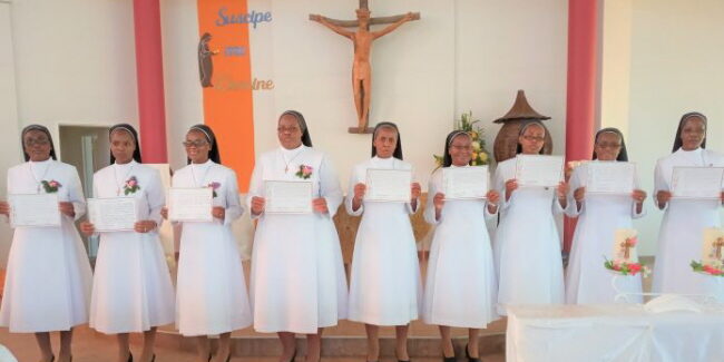 The names from left to right are:Sr. Emma Aindongo, Sr. Grace Kakweno, Sr. Mercy Gabriel, Sr. Ester Andowa, Sr. Cherubina Shiningeni, Sr. Theophora Hamukwaya, Sr. Prisca Shilongo, Sr. Ottilia Mukwangu and Sr. Hildegard Kandjimbi.